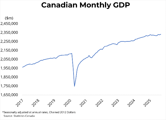 Canada’s economic performance will surprise many, with annualized growth in the third quarter far outpacing the Bank’s updated projection of 0.5 per cent. Much of this divergence is attributable to a strengthening trade balance, as imports saw their largest quarterly fall in over two years. Importantly, this quarter’s trade data is somewhat incomplete due to the US government shutdown, leaving potential for large revisions moving forward. Moreover, one-time government defense spending propelled growth forward while offsetting continued weakness in private investment. However, frail domestic demand and household consumption continue to demonstrate the fragility of the Canadian economy, which cannot rely on weakening imports or anomalous public spending to drive growth moving forward. While the Bank of Canada will likely hold its policy rate during its last meeting of the year, a weak preliminary growth estimate for October will catch their concern as global headwinds and underlying weakness in the labour market and broader economy persist.